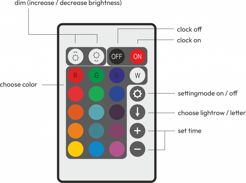 - Use the remote to turn the display on or off, adjust colors, and change other settings.